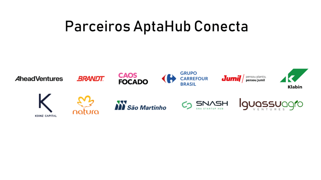Todos esses processos só são possíveis devido aos parceiros (empresas/investidores) do programa. São eles que dão forma aos desafios, orientam as oportunidades e sustentam o espaço onde a inovação aberta acontece de maneira viva e contínua. Cada empresa e cada investidor é convidado a participar considerando suas teses de investimento, áreas de atuação e alinhamento aos princípios e objetivos do programa, garantindo que as conexões criadas tenham relevância real para o ecossistema. A cada ciclo, essas parcerias são renovadas, mantendo o AptaHub Conecta sempre atualizado com as demandas do mercado e ampliando a capacidade de gerar resultados concretos para startups, pesquisadores e instituições que constroem o futuro do agro.